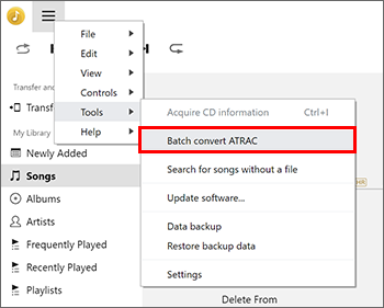 (Menu) w lewym górnym rogu ekranu, a następnie wybierz [Konwersja zbiorcza ATRAC] z menu [Narzędzia].