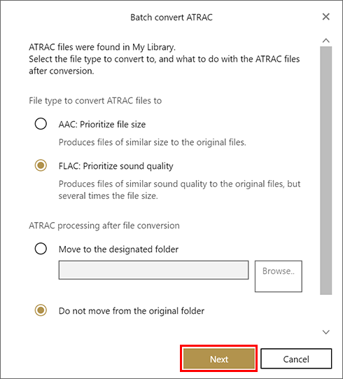 Wybierz Typ pliku do konwersji plików ATRAC do formatu, określ Przetwarzanie ATRAC po konwersji plików, po czym wybierz [Następny].