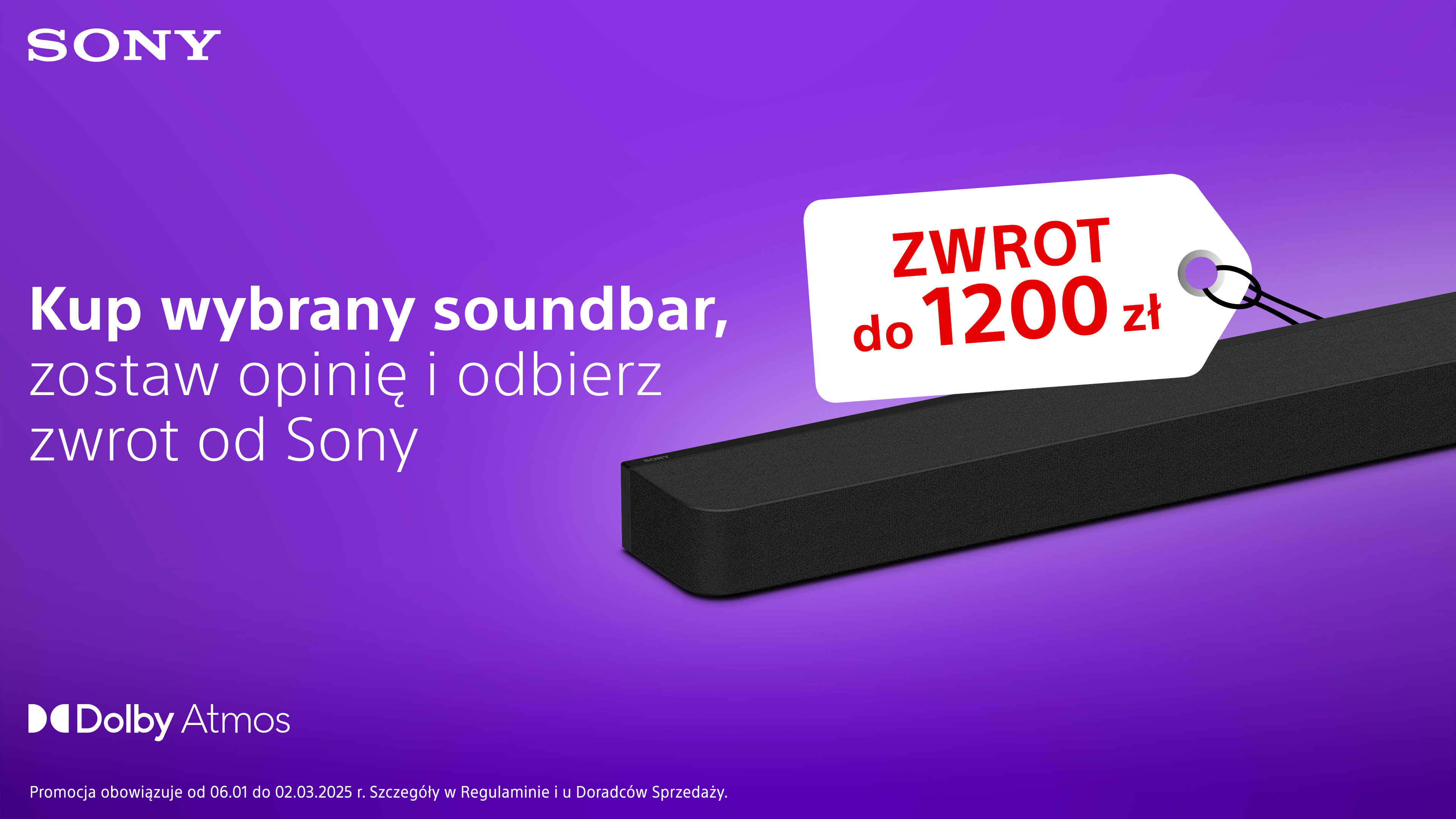 Rozpoczęła się promocja cashback na soundbary BRAVIA Theatre Bar z 2024 roku. Kup wybrany soundbar Sony, zostaw opinię i odbierz aż 1200 złotych zwrotu!